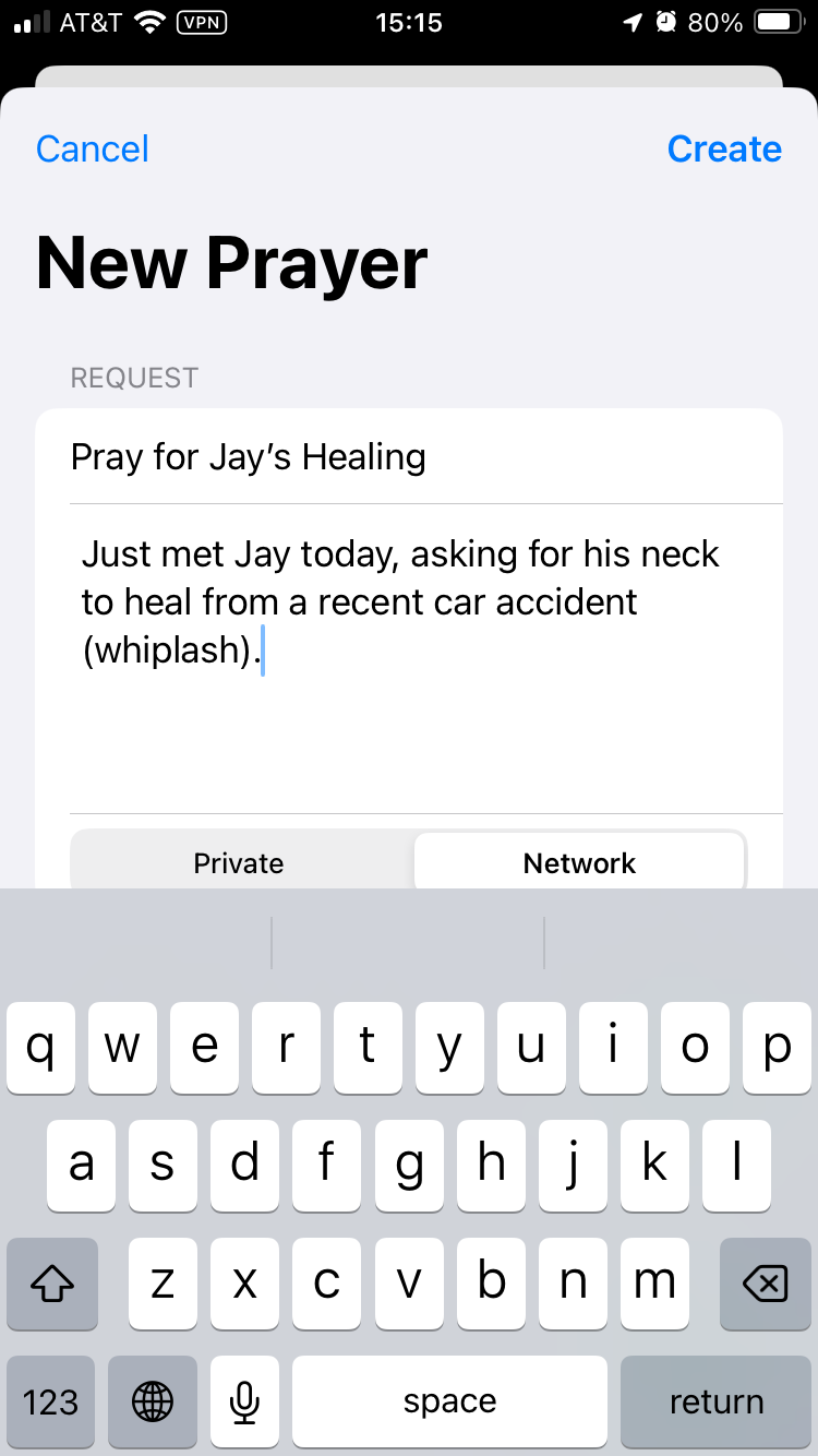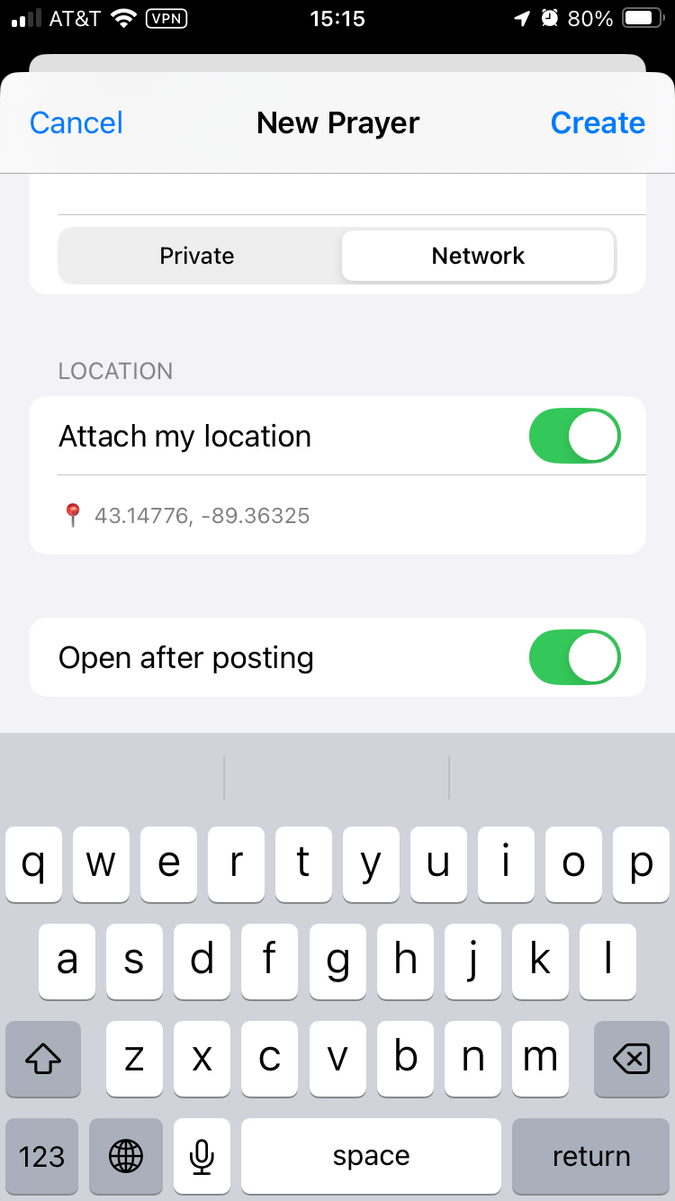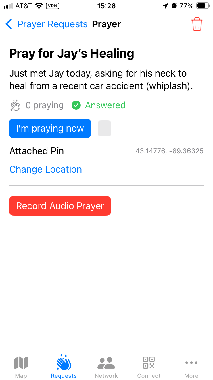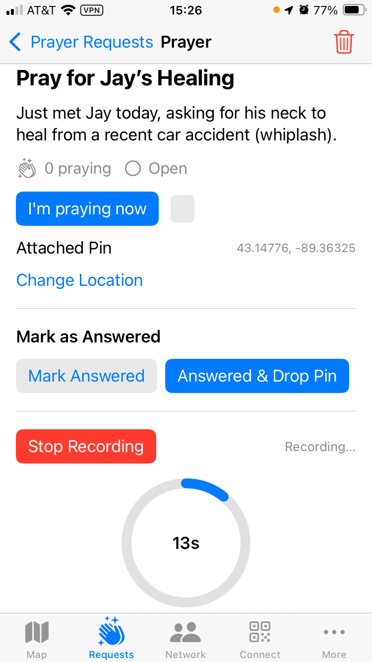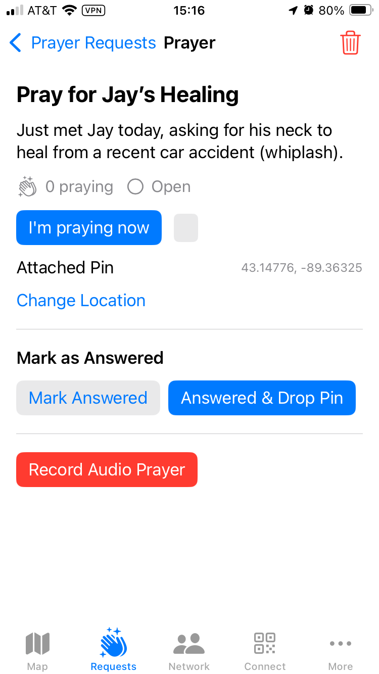 Choose to pray for a prayer request, change location, mark as answered, and/or drop a pin, as well as record an audio prayer