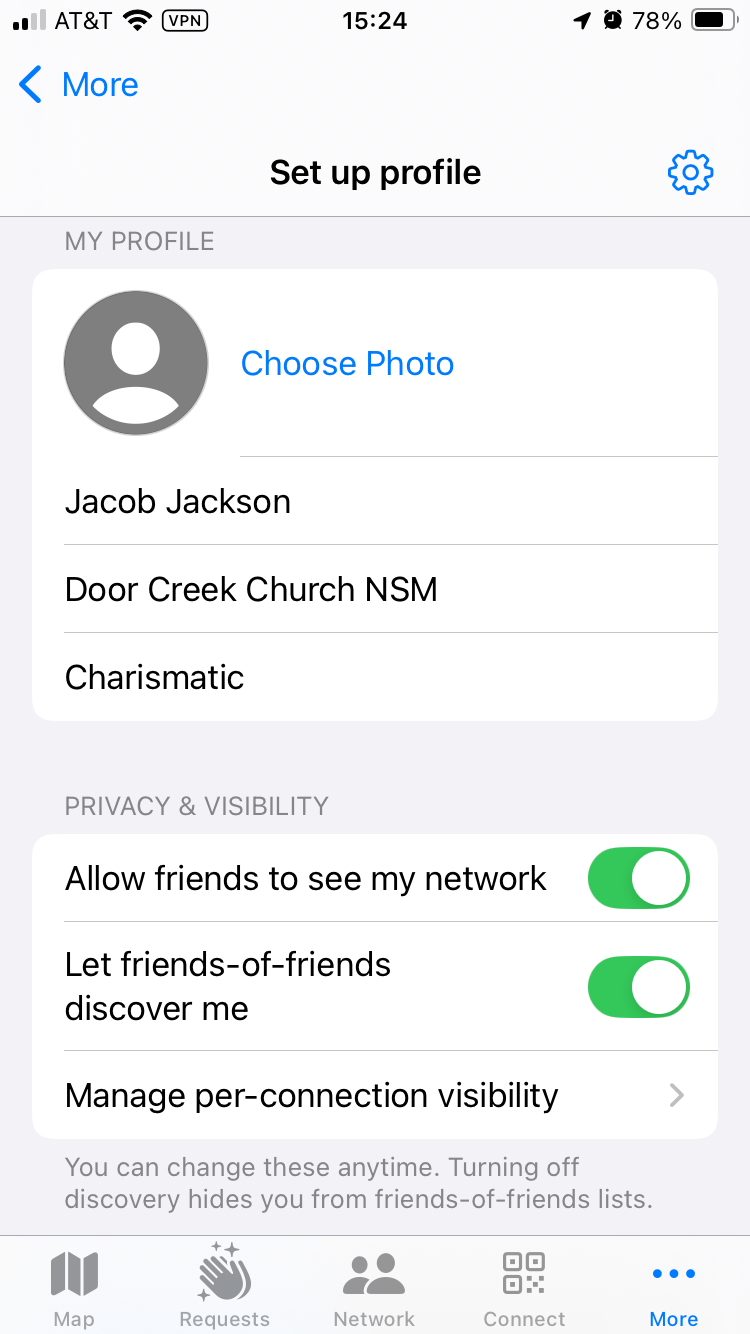 Set up your profile with your church, denomination, name, and privacy/visibility options